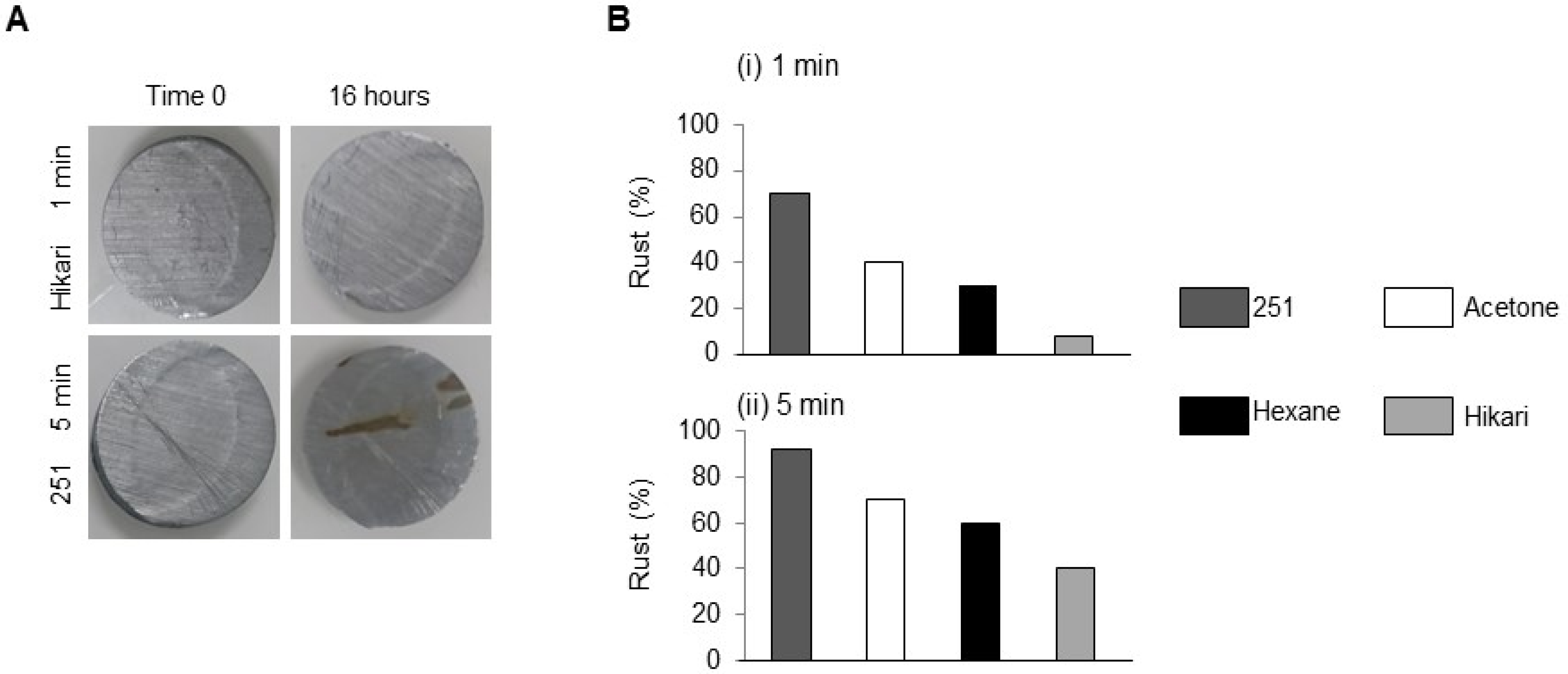 Figure 1B. Independent of immersion time (overnight ≈ 16 h) the extent of rust followed the sequence