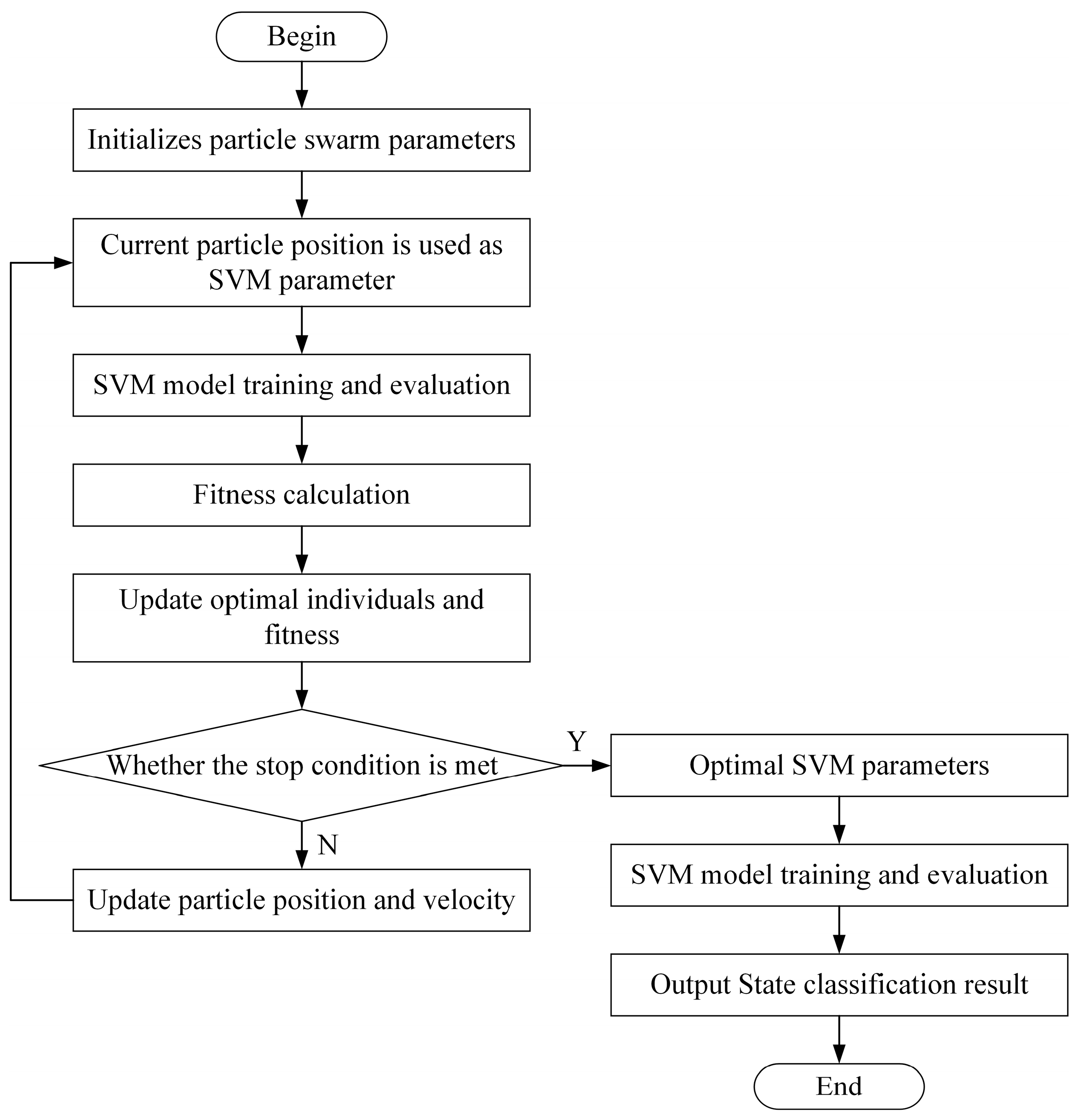 - Determine whether the optimization process meets the stop condition, that is, whether the maximum number of iteration steps is reached or the error condition is met. If the stop condition is not met, the particle swarm position and velocity parameters are updated, and steps 2 to 4 are repeated. If the condition is met, the current particle swarm parameters are output as the optimal model parameters of SVM;