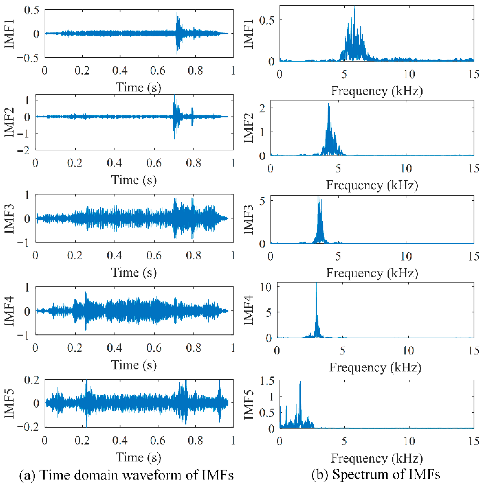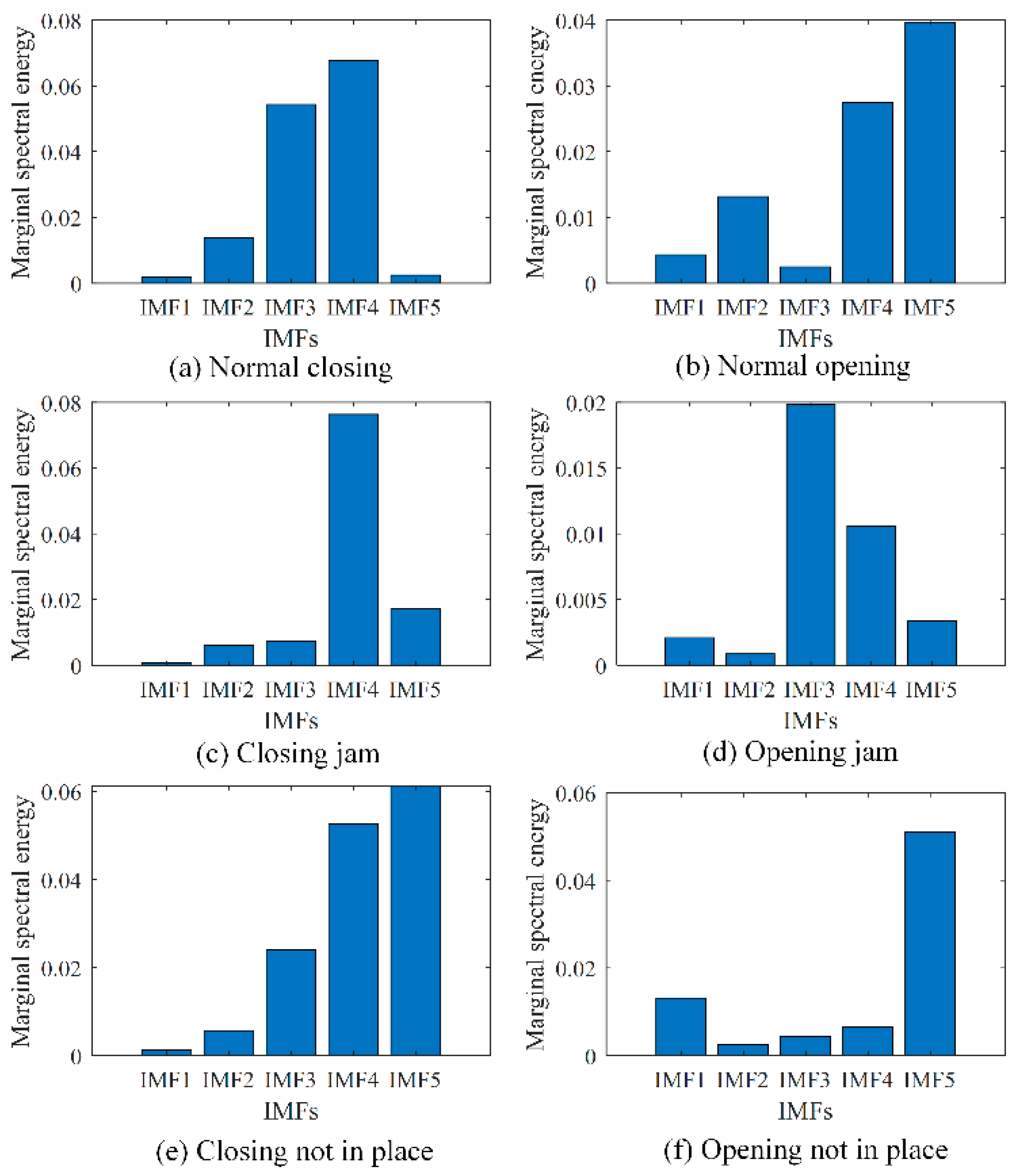 - The method based on the fusion of short-time energy features and marginal spectral energy features is proposed. The short-time energy features include the maximum short-term energy, the time point of the maximum short-term energy, and the time point of the end of movement, and the marginal spectral energy features include the marginal spectral energy of IMFs after VMD processing of vibration signals. Experiment shows that this feature extraction method can effectively distinguish different action states of disconnectors.