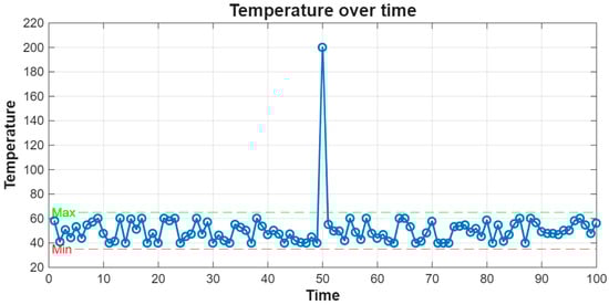 Example outlier in the motor temperature data. The blue line represents the measured temperature over time. The green dashed line indicates the maximum operating margin (65 °C) and the red dashed line indicates the minimum operating margin (35 °C). The single spike at ~200 °C is identified as an outlier outside the normal operating range.