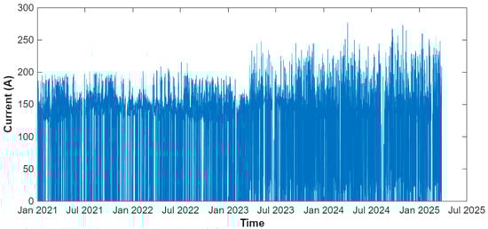Figure 5 shows the motor current over four years. As can be observed from this figure, when the current drops to zero, the mill is stopped, and using the event log, we can tag the reason for each stop. If a stop is due to an external power loss, maintenance, a communication issue, or a bad sensor value, we mark it as non-failure and replace those points as an outlier and with interpolation. If a stop is due to a mechanical/electrical failure, we keep it and split the data into run-to-failure segments to use for training of the next step. Outlier removal was applied only to shutdowns or anomalies not related to equipment degradation, such as external energy disconnections or faulty sensor readings. For example, in the current signal (Figure 5 and Figure 6), the expected normal operating value is around 140 A. After outlier removal, the accepted range of 130–150 A reflects stable operation within the normal working regime. Interpolation was therefore limited to restoring missing values within these regime-consistent bounds, preventing the creation of artificial degradation trends.