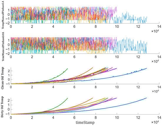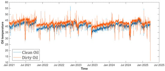 Using MATLAB’s Industrial Communication Toolbox, we established a direct interface to the AVEVA PI System and imported the SAG mill unit’s time-stamped data into MATLAB. As summarized in Table 1, the dataset includes phase voltages (phases A–C), motor speed, clean- and dirty-oil temperatures, and other relevant process variables. Records are available at a uniform 1 min cadence beginning at 00:00 on 1 January 2021, providing a continuous history for subsequent preprocessing and modeling. The PI System recorded sensor measurements at a one-minute interval. This resolution was adequate for our analysis because the key health indicator was temperature, whose degradation trend evolves gradually and does not require high-frequency sampling. The one-minute interval was therefore sufficient to capture relevant dynamics for RUL estimation in this case. In other contexts, particularly when vibration or high-frequency current signals are dominant health indicators, smaller sampling intervals would be necessary to ensure early fault detection.