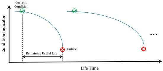 At this stage, we aim to build a training set to learn a condition indicator (CI) and estimate the RUL, as illustrated in Figure 8. In this curve, the horizontal axis represents the lifetime of the machine, while the vertical axis corresponds to the CI. Each operating segment may result in different RUL estimates depending on the current condition. The strategy is to use the available historical data to identify the most suitable predictive model for the system. Once the model is established, it can be continuously updated with newly collected data. As the system approaches failure, the model provides increasingly accurate RUL predictions.
