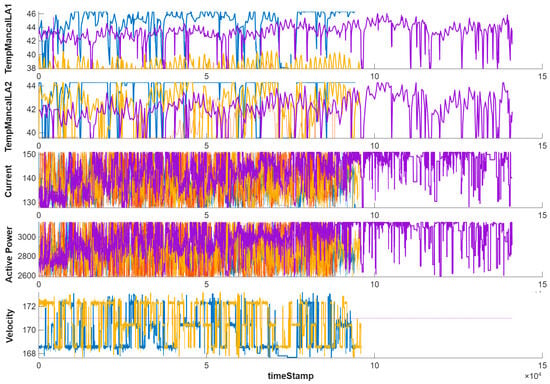 Visualization of selected sensor signals used in the modeling process. Two temperature measurements (TempMancaLA1 and TempMancaLA2) were chosen as condition variables, while current, active power, and velocity were selected as data variables. Among all available run-to-failure cases, we selected four representative cases for illustration, and the plots show these signals across the chosen cases. Different colors represent the four run-to-failure cases, and the same color is used consistently across all subplots.