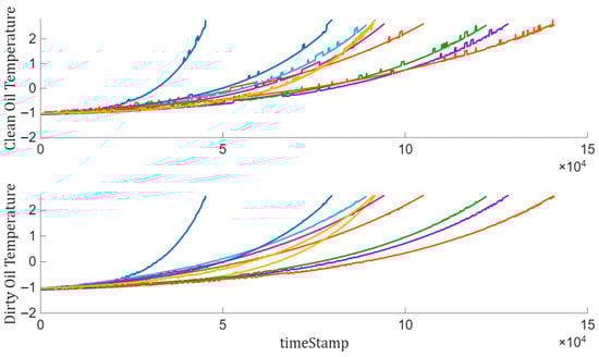 We apply the same cleaning steps to all 27 tags on the main table. Among these signals, the clean-oil and dirty-oil temperatures carry the most diagnostic value and are therefore our primary candidates for a health indicator curve. As can be observed in Figure 7, after each restart, they begin at their lowest values and, as the mill runs, they rise steadily and often reach local peaks near a stop or failure of machine. We use these two temperatures as primary health indicator signals and later segment them into run-to-failure rows for model training. In addition, the dirty-oil temperature is about 4 °C warmer than the clean-oil temperature throughout the period, reflecting expected heat pickup in the return line. Despite this offset, the two series exhibit the same oscillating pattern within each run.