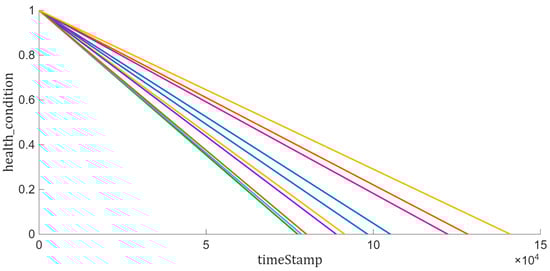 In predictive maintenance, three main classes of models are typically considered for RUL estimation: survival models, degradation models, and similarity-based models. Survival models rely on population-level statistics and require the collection of failure time data across multiple systems, making them useful when individual degradation signals are unavailable. Degradation models assume that condition indicators follow specific parametric trends (e.g., exponential or linear) and estimate RUL by extrapolating these trends to a failure threshold. Similarity-based models, in contrast, exploit complete run-to-failure trajectories by comparing partially observed degradation profiles of a unit with historical trajectories from similar systems. Since our dataset included full time-series measurements from healthy state to failure, similarity-based modeling was the most appropriate choice, enabling direct use of historical degradation patterns for RUL prediction. This part focuses on fusing the selected sensor measurements into a single health indicator, which serves as the basis for training a similarity-based prediction model. All run-to-failure trajectories are assumed to start in a healthy condition. As can be observed in Figure 12, the initial health condition is assigned to a value of 1, while the failure state is assigned to a value of 0. Between these two points, the health condition is assumed to degrade linearly from 1 to 0 over time. This linear degradation profile is then used to guide the fusion of the sensor measurements, ensuring that the constructed health indicator consistently reflects the progression from healthy operation to failure.