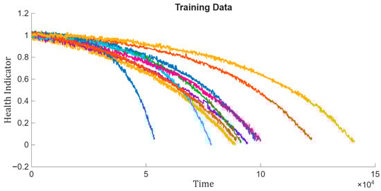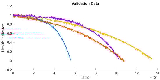 To assess the generalization capability of the proposed method, the same operations were applied to the validation dataset, which consisted of the four run-to-failure trajectories previously separated for testing. The validation data was first subjected to regime-based normalization using the regime statistics obtained from the training set. Subsequently, the same sensor fusion process was applied to construct the health indicator. This ensured that the validation data followed an identical preprocessing pipeline, allowing for a consistent evaluation of model performance. The resulting health indicator trajectories are shown in Figure 14.