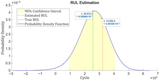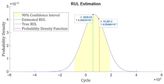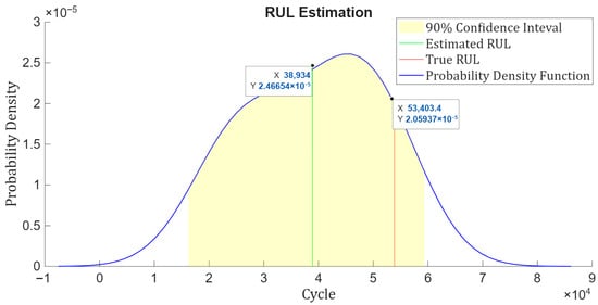 Now, we can visualize the estimated RUL compared to the true RUL, along with the probability distribution of the estimation. These results are depicted in Figure 16. As we can see in this figure, the distance between the estimated RUL and the true RUL is calculated as 53,403.4−38,934 = 14,469 min. Converting this difference into days gives 14,469/1440 ≈ 10.05 days, which means there is approximately a 10-day difference between the actual failure time and the predicted RUL. Hence, a noticeable error appears between the estimated and actual RUL when the system is in its mid-life condition.