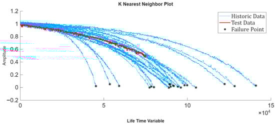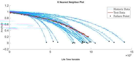 The number of nearest neighbors k is a key hyperparameter in the similarity-based RUL model. In our implementation, k was determined automatically by cross-validation, selecting the value that minimized the prediction error across the training set. This procedure balances bias and variance, ensuring that the RUL estimate is influenced by an appropriate neighborhood size rather than an arbitrarily chosen parameter. We also confirmed that small variations in k around the selected value did not significantly alter the results, indicating that the model’s performance is robust with respect to this choice. To evaluate the performance of the residual-based similarity RUL model, the prediction was tested on partial observation windows of the validation trajectories. Specifically, 50%, 70%, and 90% of each run-to-failure trajectory were used as input to the model, and the RUL was estimated at each truncation point. This approach emulates real-world scenarios where only a portion of the degradation trajectory is available and allows us to assess the accuracy and robustness of the model at different stages of equipment degradation. For the first evaluation scenario, the validation data was truncated at the first breakpoint, corresponding to 50% of its lifetime. The truncated trajectory was then used as input to the residual similarity model. The model identified the nearest neighbors from the training set based on the residual distance metric, and these were used to estimate the RUL. The validation trajectory is truncated at 50% and its nearest neighbors are visualized in Figure 15, illustrating how the model aligns the partially observed degradation pattern with historical trajectories to generate RUL predictions. The run-to-failure trajectories in the dataset span a wide range of durations, from approximately 45,000 to 141,000 min. To mitigate potential bias toward longer or shorter lifespans, the similarity-based model compares aligned residual trajectories rather than absolute times. During validation, each trajectory is truncated at the chosen observation window (50%, 70%, or 90%), and similarity is evaluated only on the overlapping portion. This ensures that similarity depends on the degradation pattern rather than total operating time, preventing systematic favoring of trajectories with specific durations.