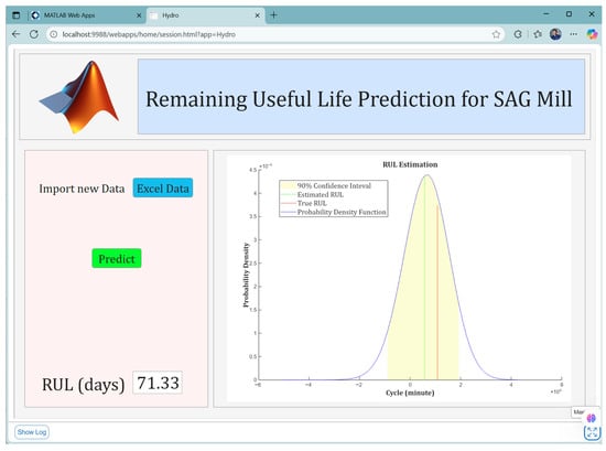 To enable practical use of the developed predictive model, we designed a MATLAB App that can automatically receive newly acquired data daily and apply the trained model to update the RUL estimation of the system. To enhance usability and ensure accessibility for end-users, the application was deployed through the MATLAB Web App Server. This deployment strategy allows the App to be executed directly from a standard web browser without requiring access to the MATLAB environment or the source code. Consequently, users can interact with the application seamlessly from various devices in the same network, such as smartphones, tablets, or personal computers, simply by opening a browser interface. This approach ensures that RUL updates are readily available in real time with minimal technical requirements. Figure 21 illustrates the deployed App operating within a web browser environment.