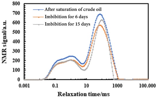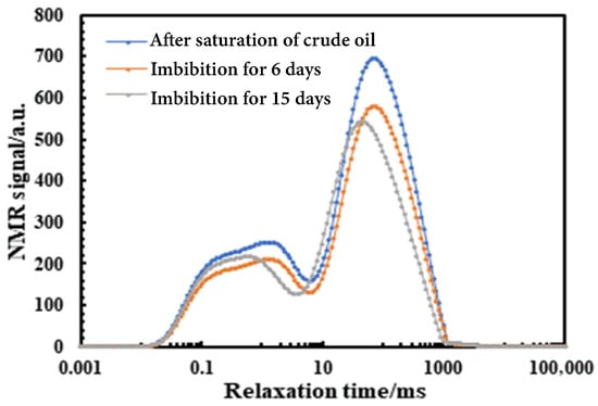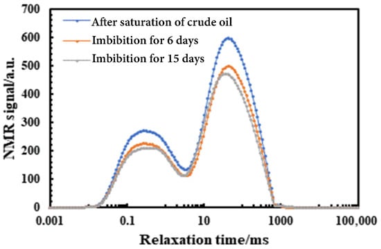 Current NMR-based imbibition studies enable the calculation of oil exchange percentage during imbibition by analyzing the amplitude variation of T2 spectrum signals. Furthermore, after determining the surface relaxivity, quantitative analysis of crude oil redistribution across pores of different sizes under high-pressure imbibition conditions can be conducted, characterizing the contribution of varying pore throat sizes to oil recovery through imbibition [,,].