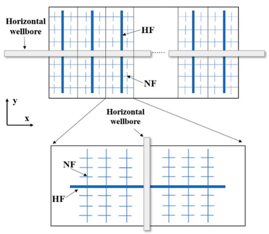 (2) The main fracture is a discrete vertical fracture, its wings are symmetrically distributed at both ends of the horizontal wellbore, and the fracture height is higher than the reservoir thickness [].