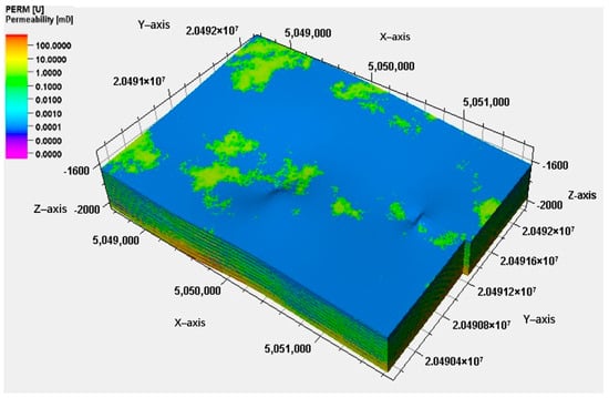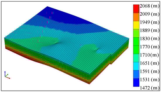 To better understand fluid flow during soaking and flowback, this work introduces an integrated workflow that begins with a hydraulic fracturing simulation. Using commercial simulator CMG, the method involves considering the imbibition effect during the injection of fracturing fluid with separate parameters for fractures and matrix; tracking fluid distribution during shut-in and flowback using dynamic geological models; integrating wellhead, stratigraphic, logging, and trajectory data; applying shale content (SH) cutoffs from logs to distinguish sand and shale layers; and generating reservoir properties through sequential Gaussian simulation, tuned with field data from the Erlian Block. This approach enables physics-based simulation of the entire fracturing-to-production process, improving model accuracy and practical relevance for reservoir management. The three-dimensional geological model established is shown in Figure 5. The geological model was imported into CMG software for simulation, and to achieve optimal matching accuracy and computational efficiency, grid sensitivity analysis was conducted, which determined the optimal grid size of 10 m × 10 m × 10 m for individual simulation cells. The numerical model of shut-in well backflow is shown in Figure 6.
