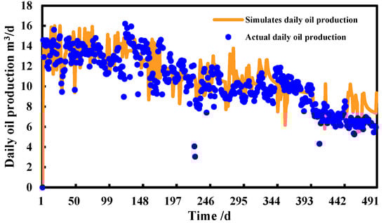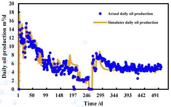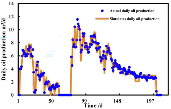 The model was fitted to the production history to correct the phase permeability curve and reservoir parameters to accurately reflect the actual production in the oilfield, as shown in Figure 7, Figure 8 and Figure 9.