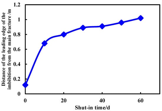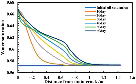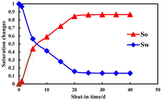 After the fracturing fluid retained in the post-fracturing well is in contact with the formation, the crude oil in the matrix is replaced by capillary force. After the completion of reservoir fracturing, the fracturing fluid in the hydraulic fracture begins to be filtered into the matrix, and with the increase in the shut-in time, the water saturation in the main fracture decreases, the oil saturation increases, and the water saturation of the matrix system increases. The oil saturation of the fracture after 40 days of well shut-in can reach up to 86%, and the saturation change process of the fracture system is shown in Figure 11.