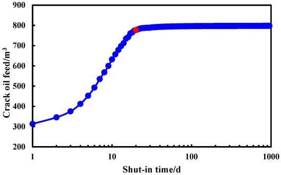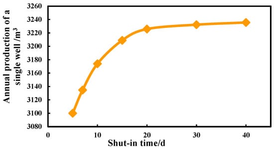 Shut-in duration significantly enhances short-term production. This is because the imbibition of fracturing fluid significantly increases water saturation in the matrix near fractures, elevating capillary pressure to levels that may even exceed the pressure differential achievable during production, consequently causing water blocking. As production proceeds, reservoir pressure declines and fractures close, necessitating the dynamic adjustment of the optimal production strategy. Therefore, the shut-in time is optimized with the target of maximizing the first-year production of individual wells []. The cumulative oil production of the reservoir in the Erlian Block peaked significantly in about 20 to 30 days, and then tended to be stable. Combined with the analysis of the reservoir imbibition displacement law during the well shut-in period and the annual production of a single well with different well shut-in times, it is considered that the optimal well shut-in time in the Erlian Block is about 20–25 days.