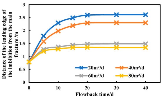 After the fracturing construction is completed, the oil well flows back, and in the process of flowback, with the rapid discharge of fracturing fluid, the osmotic pressure of the formation and fracture increases, and the imbibition displacement of unconventional reservoir oil continues to occur []. The oil saturation distribution of unconventional reservoirs under different flowback velocities of the block reservoir is simulated, and the reservoir flowback discharge distance is shown in Figure 15.