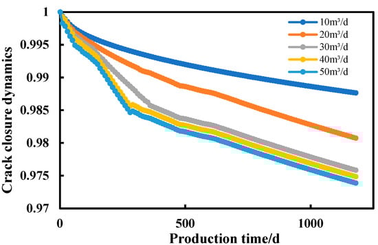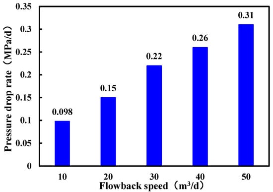 Under the same flowback time, the larger the flowback velocity, the greater the decrease in crack volume and the greater the pressure drop gradient. The crack closes quickly at the beginning of the flowback and gradually slows down later. When the flowback speed is 10–20 m3/d, the crack closure degree is 1.2–1.9%, and the pressure drop rate is 0.098–0.15 MPa/d. At 40–50 m3/d, the crack closure degree is 2.5–2.6%, and the pressure drop rate is 0.26–0.31 MPa/d.