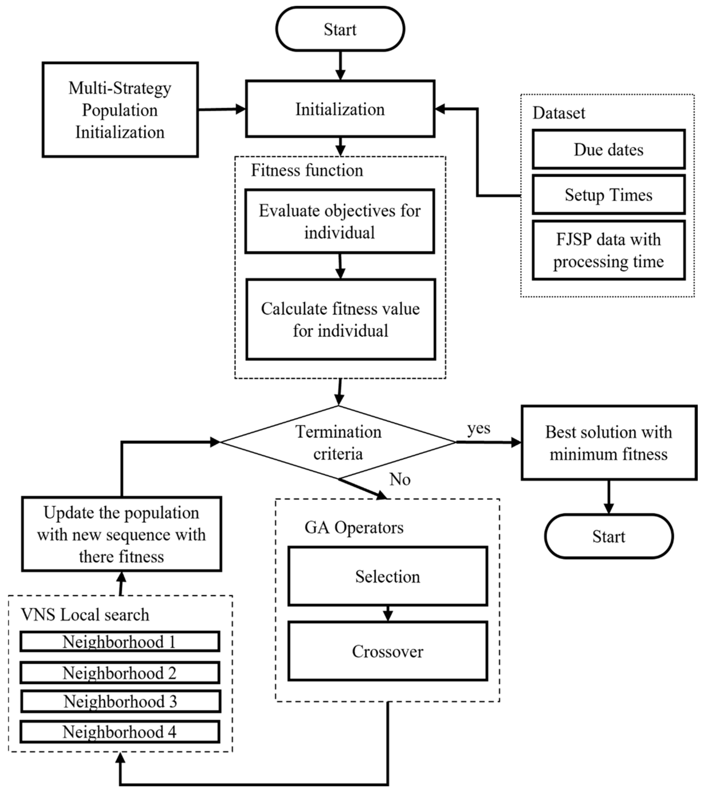- Sun, K.; Zheng, D.; Song, H.; Cheng, Z.; Lang, X.; Yuan, W.; Wang, J. Hybrid Genetic Algorithm with Variable Neighborhood Search for Flexible Job Shop Scheduling Problem in a Machining System. Expert Syst. Appl. 2023, 215, 119359. [Google Scholar] [CrossRef]