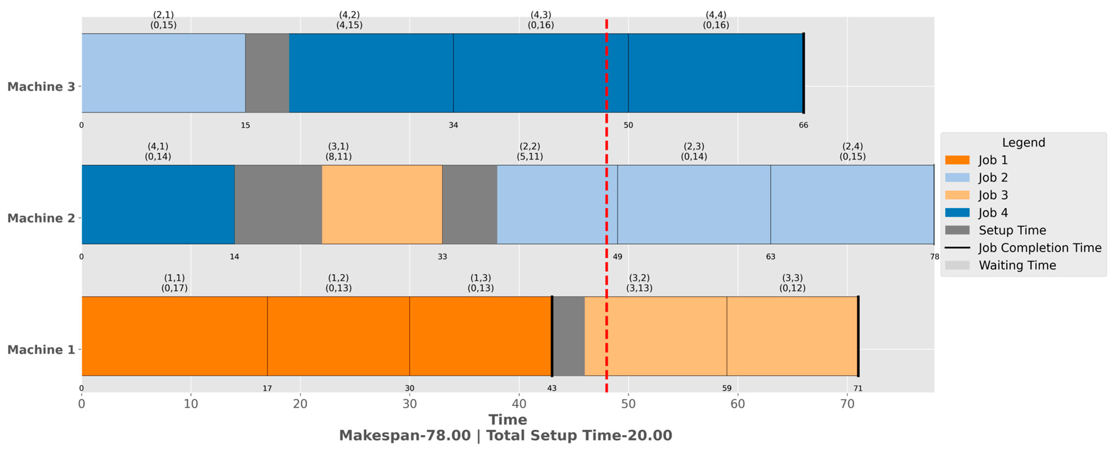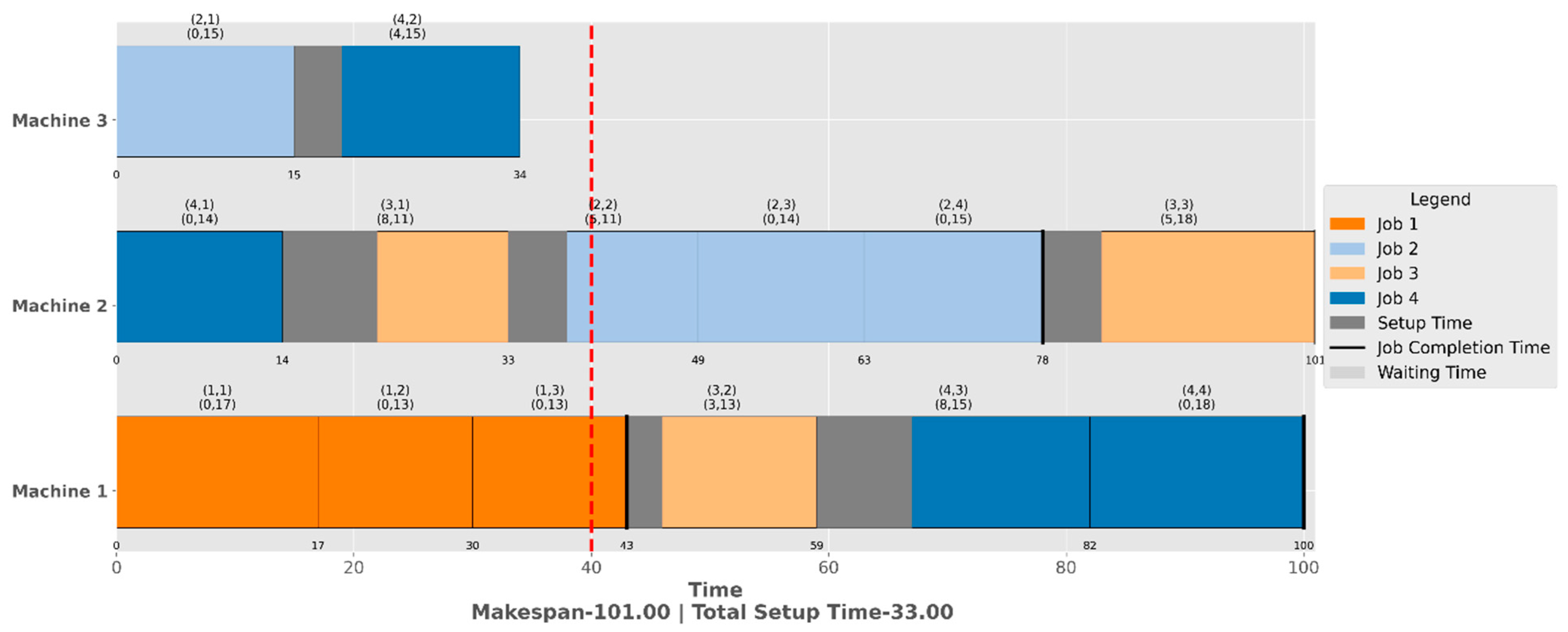 - Completion time constraint: The completion time of operation k of job j on machine i is the sum of its start time, processing time, and setup time.