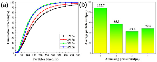 (a) Cumulative distribution curve of aluminium powder particle size; (b) Relationship between atomization pressure and average particle size.