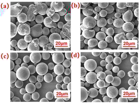 where is the density of the metal, is the diameter of the droplet, L is a constant. As can be seen from Equation (2), surface energy of a metal droplet is inversely proportional to its diameter . With the increase of atomization gas pressure from 1 MPa to 3 MPa, the impact of the gas on the liquid aluminium droplet becomes intense. Therefore, an appropriate increase in the atomising gas pressure can improve the surface energy of the droplets, and the powder can be refined.