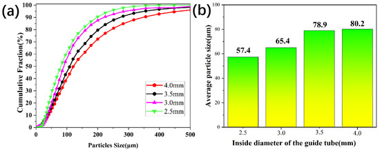 Diameter of delivery tube versus aluminum particle size: (a) Cumulative distribution; (b) average particle size.