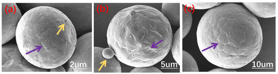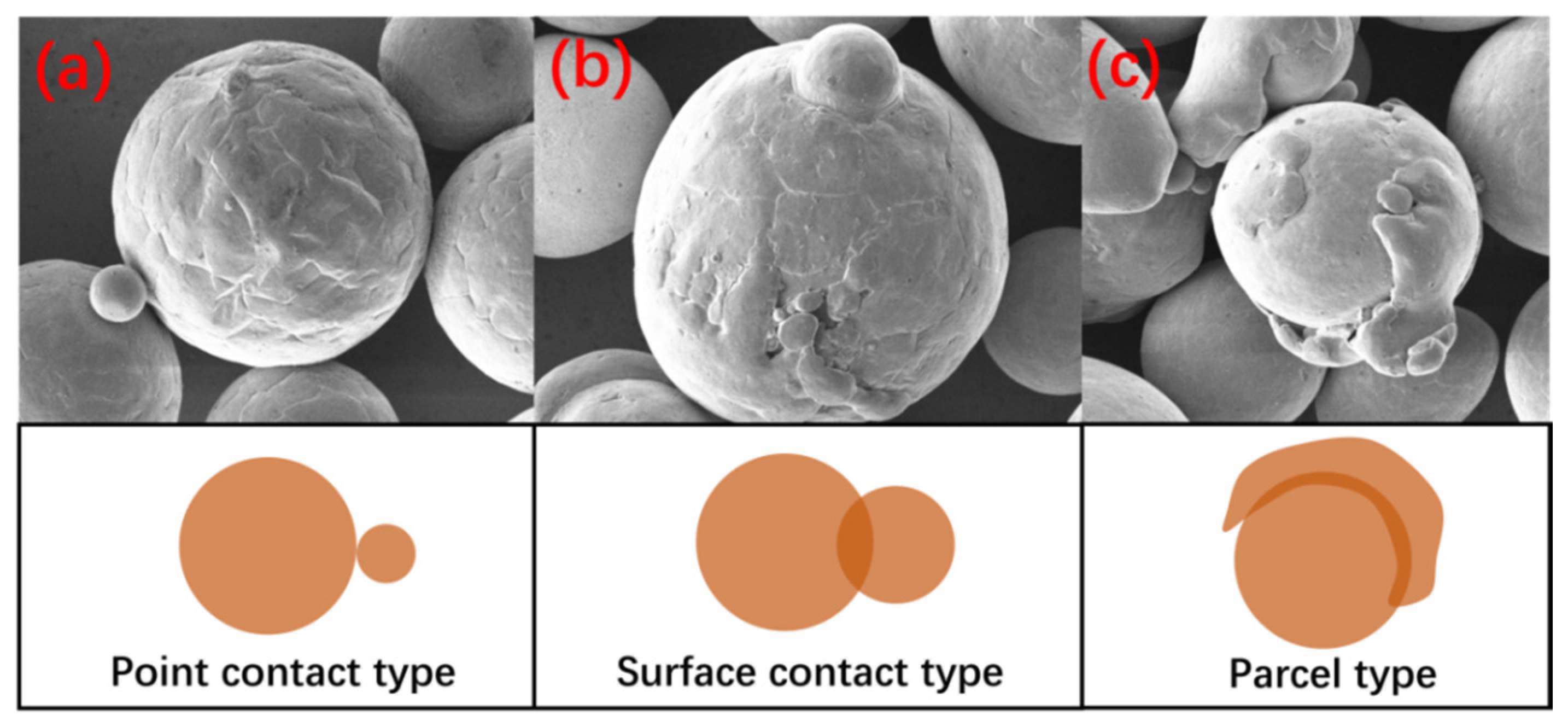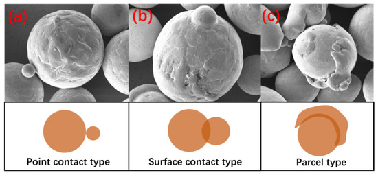 Satellite sphere particles are formed due to the differences in the solid-liquid morphology of the droplets and the formation of rapid collisions [25]. As shown in Figure 15, satellite sphere particles include three types: the first one is the point contact type shown in Figure 15a. The point contact satellite sphere is generated at the bottom of the atomization zone. When the metal droplet is about to solidify, it rapidly collides with other powders that are about to solidify or have already solidified. The second one is the surface contact type shown in Figure 15b; a surface contact type satellite sphere is generated in the middle of the atomized zone. During the solidification stage of the metal droplet, it undergoes rapid collisions with other powders that are about to solidify or have already solidified. The third one is the parcel type shown in Figure 15c. The encapsulated satellite spheres are generated in the upper part of the atomization zone. When the metal droplet is in the liquid stage, it undergoes rapid collisions with the solidified powders.