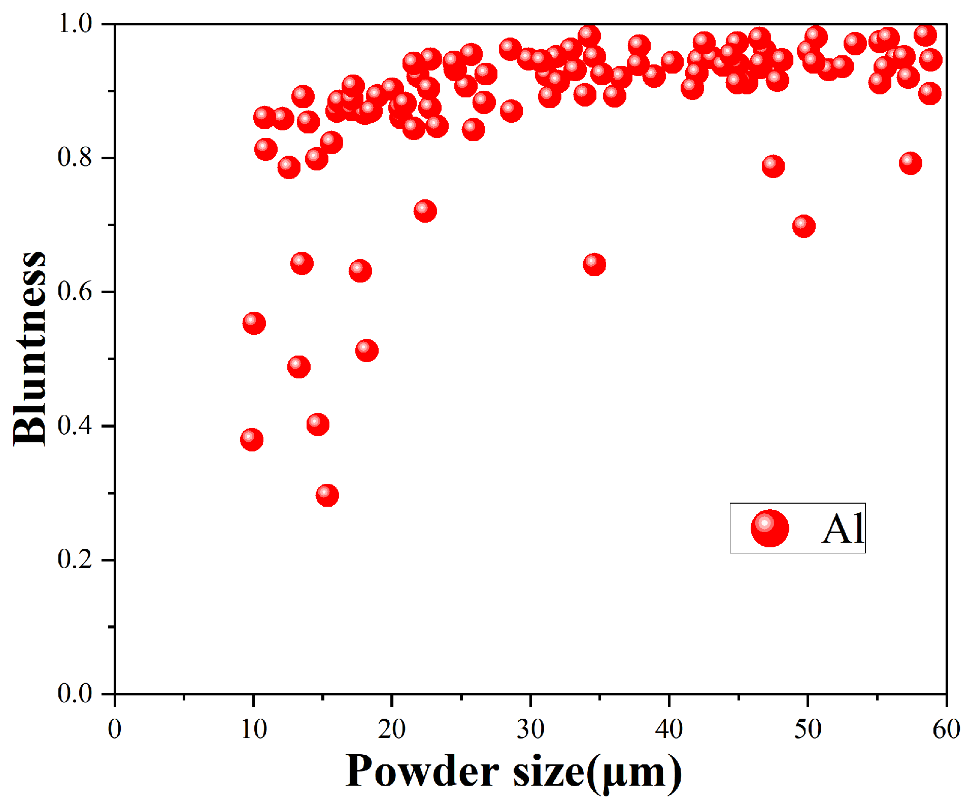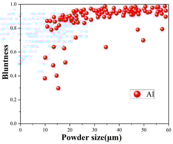 The most accurate quantification of sphericity is bluntness. the bluntness of the powders at different powder sizes are shown in Figure 9. It can be seen that in the powders with particle size of 0–60 μm, the larger the powder size is, the tends to increase. The bluntness of the majority of powders exceeds 90%. This means that most of the aluminum powders exhibit a high sphericity.