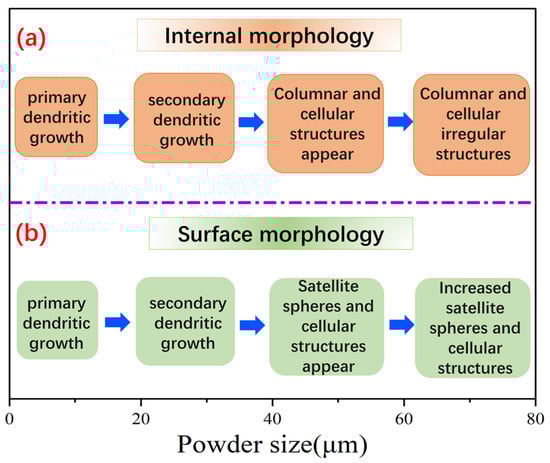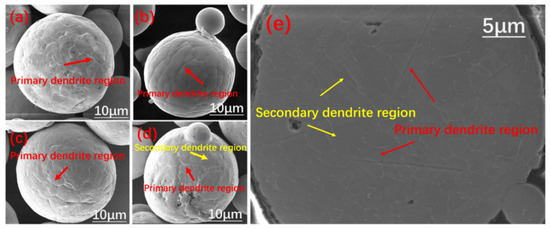 It can be seen from the Equation (10) that the existence of the temperature change rate provides a good kinetic foundation for the growth of dendritic structures. With the increase in the particle size, the temperature change rate decreases. The solidification time governs internal dendritic structure development. For fine powders with a size range of 0–35 μm, the rapid solidification of their surfaces gives rise to the cellular or dendritic surface structures during the atomization process. However, inside the fine powder, only primary dendrites can be observed. For large powders with a size more than 35 μm, the decrease of temperature change rate makes the overall solidification time increase. Secondary dendrites have sufficient kinetic conditions for growth, so primary dendrites and secondary dendrites coexist on the surface of the powder. In addition, since the cooling rate of satellite spherical powder is higher than that of the ordinary particles, the cooling rate at the interface is accelerated, leading to the formation of cellular structures at the interface of satellite powder.