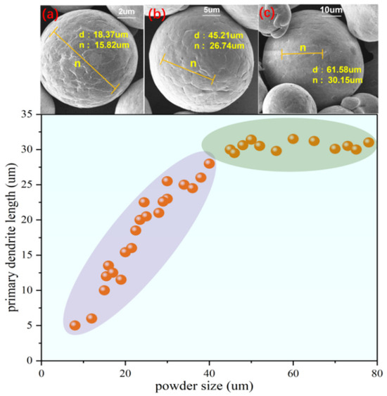 Solidification of the atomized molten droplets goes through the nucleation, the growth of the primary dendrite and the secondary dendrite [22]. When the nucleation is completed, the growth of primary dendrites begins. The latent heat released by the droplets will generate a temperature change (ΔT) perpendicular to the primary dendrites, which is a necessary prerequisite for the formation of the secondary dendrites. It can be seen from Equation (9) that the spacing and growth of secondary dendrites are determined by the solidification rate. High solidification rate makes droplet with small particle sizes semi-solid, thereby inhibiting the growth of secondary dendrites. As a result, the secondary dendrites are mostly present in powders with larger particle sizes. Combining Formulas (8) and (9), the relationship between the particle size of the powder and the solidification time can be obtained [22].