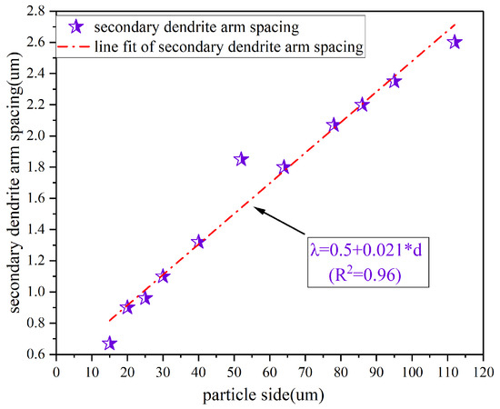 Variation curve of the secondary dendrite arm spacing as a function of the powder size.