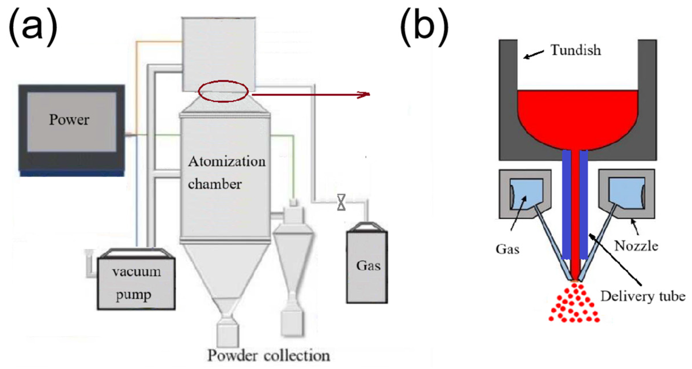 Figure 1. The structure and working principle of metal atomization equipment. (a) The structure of atomization equipment. (b) The principle of atomization equipment.