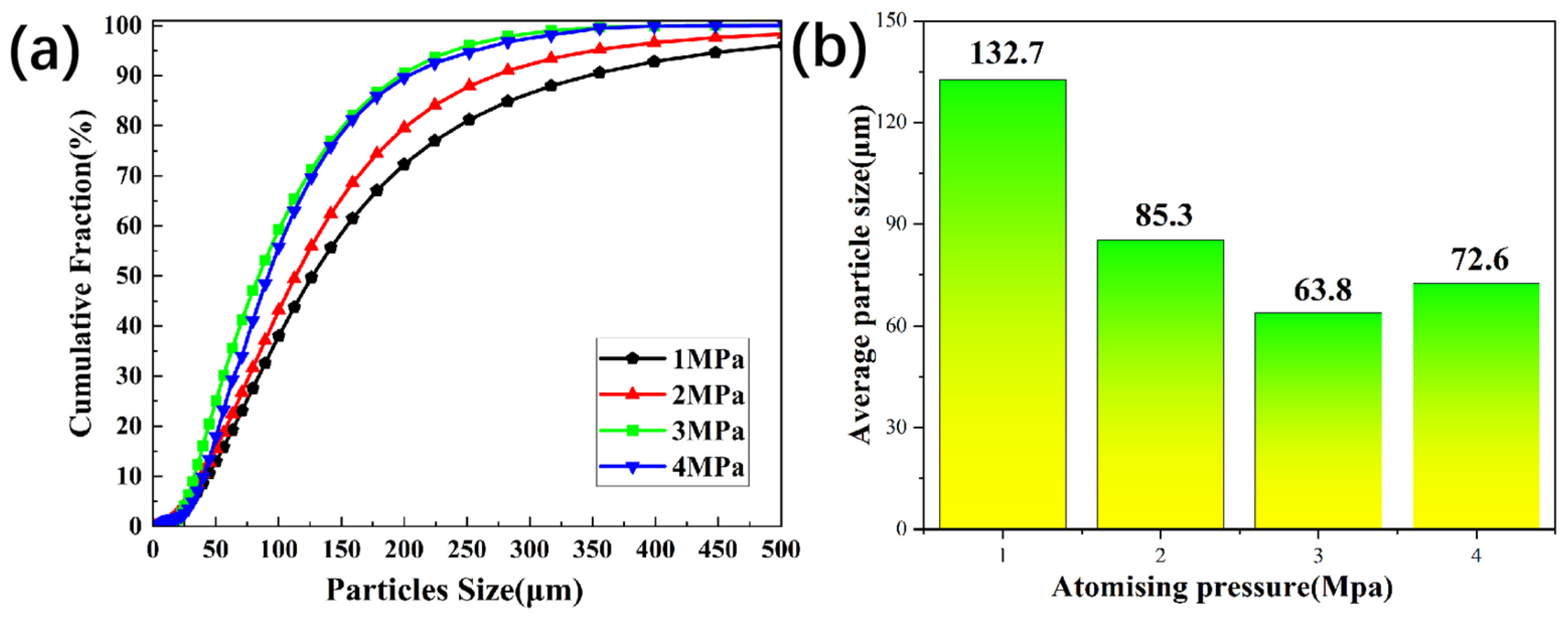 Figure 2. (a) Cumulative distribution curve of aluminium powder particle size; (b) Relationship between atomization pressure and average particle size.