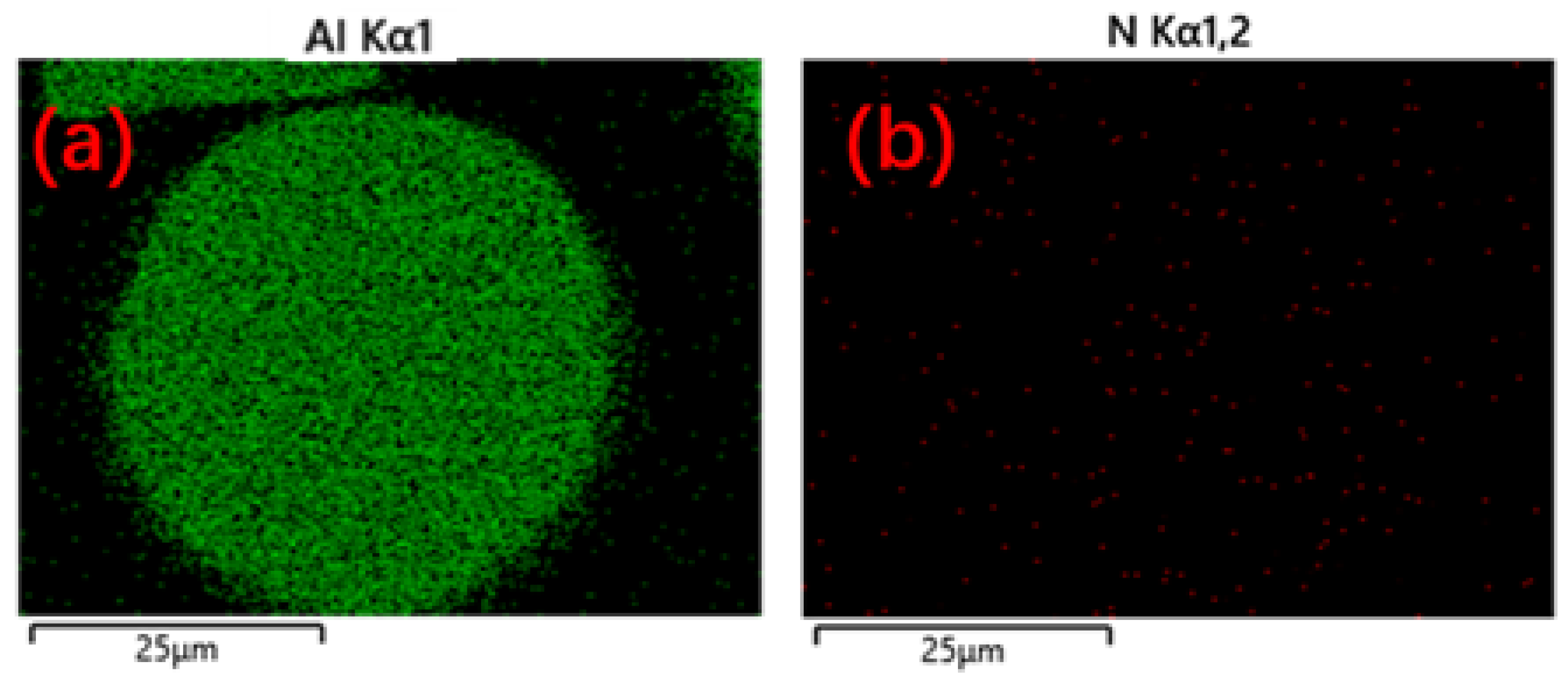 Figure 6. EDS analysis of aluminum powder. (a) Distribution of aluminum; (b) Distribution of N.