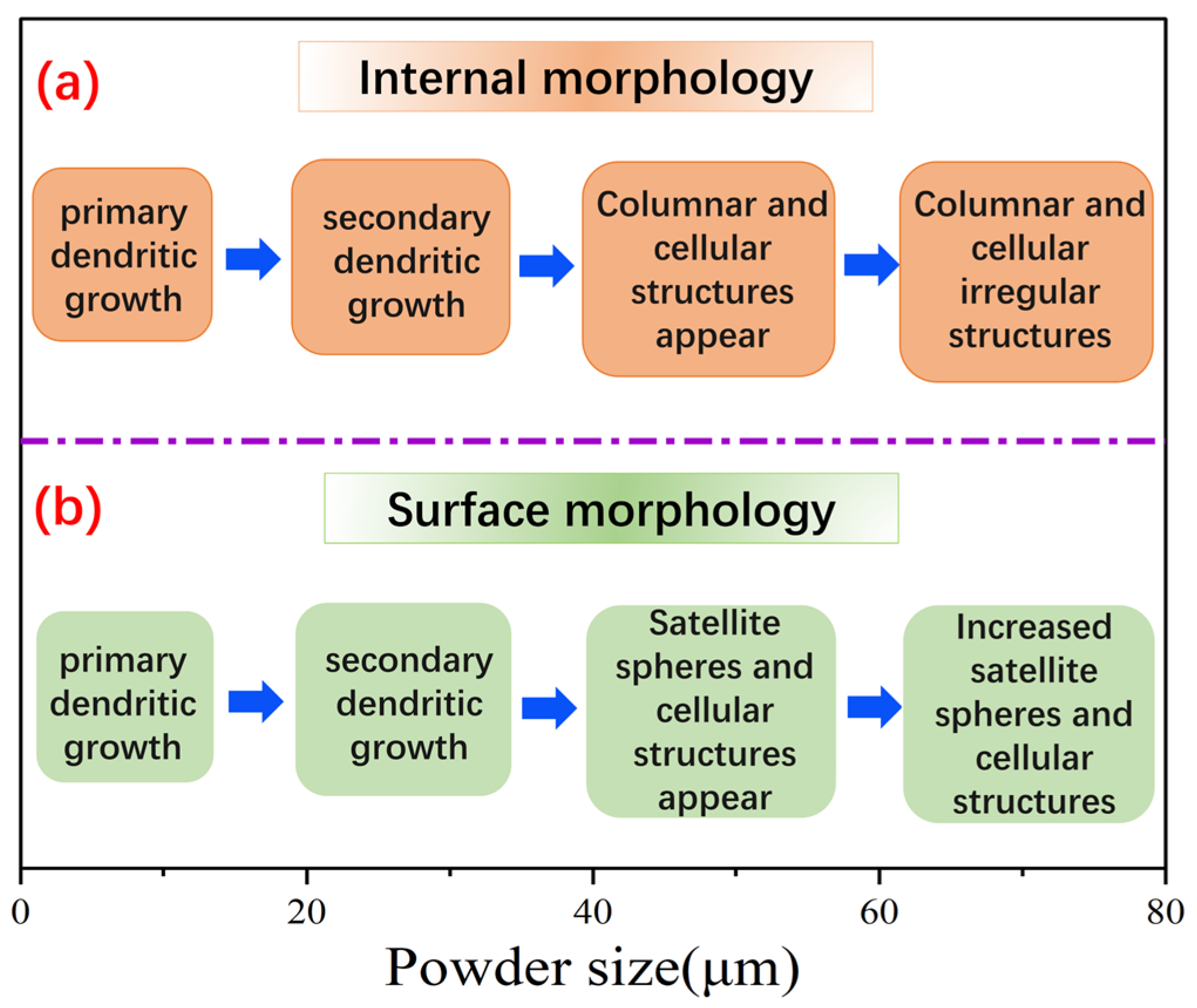 Surface microstructure is mainly dendritic and cellular due to the adhesion of satellite spheres. The internal microstructure was affected by ΔT and dendrite remelting, and the microstructure evolved from dendrites to columnar isometric and spherical or sub-spherical isometric microstructure with increasing powder particle size.