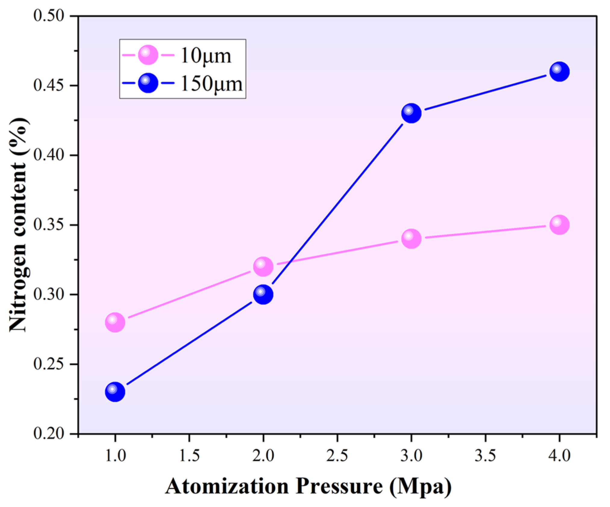 The nitrogen content in the powder increases with increasing pressure in the atomization chamber. High gas pressure can effectively inhibit the nitrogen precipitation behavior.
