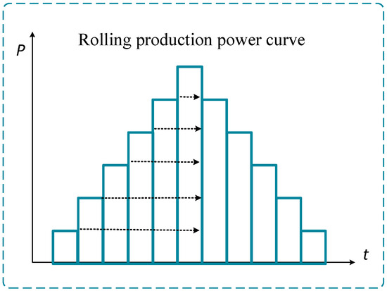 The steel industry has long been recognized as an energy-intensive sector. China is one of the world’s largest steel producers, with annual crude steel production consistently stable around 750 million tons, driven by government policies aimed at eliminating outdated production capacities. Currently, the average electricity consumption per ton of crude steel in China is approximately 500 kWh, accounting for 10% of the nation’s total electricity usage. The industry’s power demand is highly varied, involving equipment such as rolling mills, electric-arc furnaces, oxygen generators, blowers, pumps, and conveyors. Previous studies typically classified steel industry loads into shock loads and steady loads [26]. To better understand load fluctuations, this study categorizes them based on their dynamic characteristics: shock loads associated with process-specific impacts and stable loads. Figure 1 and Figure 2 illustrate the power curve of a steel plant in a Chinese city, showing the rolling process. Steel billets first pass through roughing mills, followed by multi-pass rolling, before entering the finishing mills, where they move at a constant speed. Each pass through a mill induces power fluctuations due to mechanical impacts on the billets.