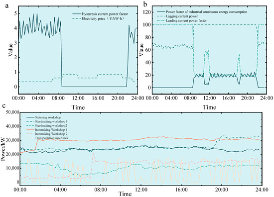 Figure 3. Load input variables in the steel industry: (a) hysteresis current power of steel loads and price; (b) power factor of industrial continuous energy consumption, lagging current power, and leading current power factor; (c) different workshop loads.