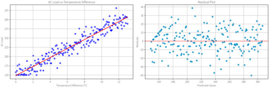 In addition, the linear relationship between air-conditioning load and temperature difference (ΔT) is analyzed using more than 30,000 samples collected from a region in China. As shown in Figure 5, the blue dots represent individual observations of air-conditioning load corresponding to different temperature differences. The data points are generally concentrated along the red regression line, indicating a strong and significant positive correlation between the two variables. The residual plot on the right further illustrates that the residuals (blue dots) are randomly scattered around the zero line, with no apparent pattern or systematic bias. This random distribution suggests that the model’s linearity assumption is valid and that the regression adequately captures the main relationship between air-conditioning load and ΔT.