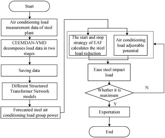 Based on this complementary relationship, this paper proposes an aggregated modeling method combining a steel-load power characteristic model with an air conditioning load model based on the Equivalent Thermal Parameter (ETP). To accurately forecast both steel and AC loads, a parallel Transformer-LSTM framework is applied. Additionally, to reduce large fluctuations in steel loads, the CEEMDAN-VMD method is utilized for noise reduction, while the Quantile Regression (QR) method is used to calculate the confidence intervals of the load responses [25]. Moreover, considering the varying start-stop strategies of electric-arc furnaces and the demand response potential of AC load groups, a collaborative scheduling strategy is introduced. This scheduling strategy focuses on reducing peak demands and minimizing load fluctuations, while ensuring cost efficiency and maintaining user comfort.