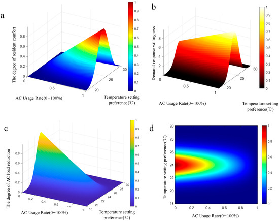 Figure 13. Adjustable potential analysis of air conditioning load: (a) impact of AC usage probability and temperature preference on comfort; (b) impact of AC usage rate and temperature preference on demand response willingness; (c) impact of AC usage rate and temperature preference on peak load reduction; (d) impact of temperature setting and opening probability on AC load adjustability.