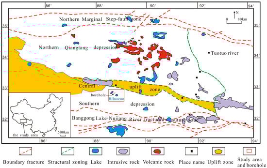 The Northern Tibetan Plateau Basin is a large Late Paleozoic-Mesozoic marine sedimentary basin []. Tectonically, the Northern Tibetan Plateau Basin is an important part of the large Tethys-Himalaya tectonic domain []. As shown in Figure 1, the Northern Tibetan Plateau Basin is bounded to the north by the Hoh Xil-Jinshajiang suture belt and to the south by the Bangong Hu-Nujiang suture belt [,,] and can be divided into three structural units from north to south: north depression, central uplift belt, and south depression [,]. The Biloucuo area studied herein is located in the Shuanghu area of the south depression.