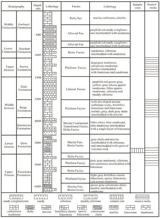 The present emergent strata in the Northern Tibetan Plateau Basin are of the Triassic, Jurassic, and Cretaceous age. The Jurassic marine strata are (from bottom to top): Lower Jurassic Quse Formation (J1q), Lower-Middle Jurassic Quemoco Formation (J1–2q), Middle Jurassic Buqu (J2b) and Xiali (J2x) Formations, Upper Jurassic Sowa Formation (J3s), and Upper Jurassic-Lower Cretaceous Bailongice Formation (J3s) [,]. Among these, the Middle and Upper Jurassic is characterized by the mutual association of different strata, including the Jiabuqu clastic rocks and Sowa limestone of the Quemoco, Xiali, and Xueshan formations. Overall, the thickness of the Jurassic strata is >3000 m, and the thickness of the Lower Jurassic Quse Formation shale is >100 m (Figure 2). Among them, the Xiali (J2x) of the Middle Jurassic was formed as a reservoir, and its lithological characteristics were mainly lithic quartz sandstone.