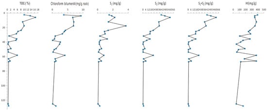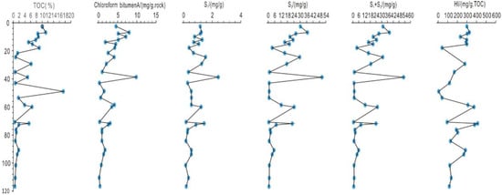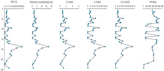 The TOC contents of the Jurassic drill core samples from wells BK1, BK2, and BK3 in the Biloucuo area ranged from 0.48% to 17.40%, 0.49% to 16.60%, and 0.40% to 20.70%, respectively, with average values of 4.42%, 4.80%, and 4.04%, respectively (Figure 3, Figure 4 and Figure 5). These very high organic matter abundances indicate that the Jurassic rocks in this area are good source rocks with a high exploration potential. Mud shale with a TOC content >0.5% is considered an effective source rock, while a TOC content >2% is regarded as a very high-quality source rock [,]. Nearly all the samples analyzed from this study area had TOC contents >0.5%. Samples with TOC contents >2% accounted for 48.3% (14/29), 54.5% (12/22), and 70.3% (26/37) of the selected BK1, BK2, and BK3 samples, respectively. These data indicate that each drill core comprised >100 m of potential source rocks, and over half of the samples could be classified as high-quality source rocks.