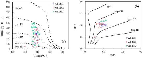 The type of organic matter usually reflects the hydrocarbon generation characteristics of a source rock []. Standard methods used to classify types of organic matter in source rocks include rock pyrolysis, kerogen microscopy, and atomic ratios. Previous studies have shown that the organic matter in source rocks of the Northern Tibetan Basin is complex, and includes type I, type II, and type III; for Jurassic source rocks, types I and II1 are dominant, with small amounts of type II2 [,]. The results of the sample pyrolysis herein showed that the hydrogen index (HI) of Jurassic source rocks in the Biloucuo area of the Northern Tibetan Basin was mainly between 100 and 500 mg/g TOC, and the organic matter was mainly of the type II variety, with >60% of samples being of type II1 (Figure 6a). The elemental analysis of kerogen showed that the H/C and O/C ratios of samples mainly ranged from 0.8 to 1.3 and 0.06 to 0.11, respectively (Figure 6b). According to kerogen atomic ratio classification, both of these ranges of ratios equate to type II1 organic matter (Figure 6b), giving somewhat different results to those using the HI division.