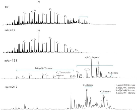 The analysis method for soluble hydrocarbons in the source rock samples was as follows: each drill core sample was crushed to 100 mesh and extracted via the Soxhlet method using a mixture of methylene chloride:methanol (93:7, v:v) for 72 h to obtain chloroform asphalt “A”. After the asphaltene in asphalt “A” of chloroform was precipitated with n-hexane, column chromatography was used to separate the saturated hydrocarbons, aromatic hydrocarbons, and non-hydrocarbons using n-hexane, n-hexane:dichloromethane (1:2, v:v), and methanol, respectively. The saturated hydrocarbon fractions were analyzed and identified by gas chromatography–mass spectrometry (GC-MS) using an Agilent Technologies Inc. instrument. The parameters were as follows: MS of 5973N, ion source temperature of 250 °C, and ionizing voltage of 70 eV. GC was 6890N, the chromatographic column was HP-5MS (30 m × 0.25 mm), the film thickness of the fixed phase was 0.25 µm, the carrier gas was high-purity helium, the initial temperature was 80 °C, the temperature was increased to 290 °C at 4 °C/min, and then the temperature was maintained at a constant for 30 min.