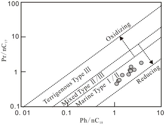 The ratio of Pr/Ph in the Biloucuo area of the Northern Tibetan Basin ranges from 0.47 to 0.71, with a mean value of 0.56 (Figure 8). The distribution of Pr/Ph in the crude oil samples is concentrated, showing a strong phytane advantage [,,]. The Pr/nC17 and Ph/nC18 values of the samples in the study area are mainly distributed between 0.12~1.80 and 0.21~3.75, respectively. The Pr/nC17 and Ph/nC18 values of the source samples are narrowly distributed (Figure 9), indicating their origin from a similar biological source. The samples are mainly distributed in the strongly reducing marine environment with type I and type II organic matter as the parent material.