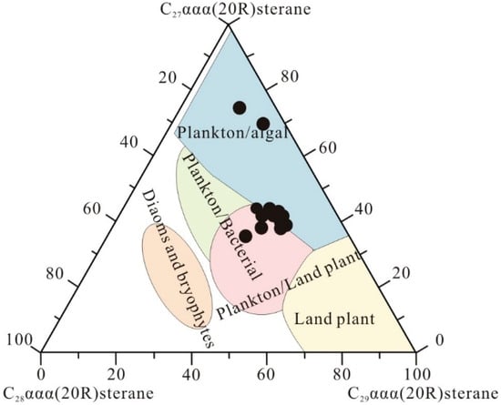 In general, C29 sterols are the main cholesterol type in higher plants, whereas aquatic algae contain comparatively high C27 sterol levels. Sterane originates from sterols [,], and, therefore, the relative abundance of C27ααα(20R) sterane, C28ααα(20R) steranes, and C29ααα(20R) steranes in samples can be used to reflect the source of the organic matter of the parent material. The C27ααα(20R) sterane content in the source rocks in the study area ranges from 36% to 75%, with an average of 45%, while the C29ααα(20R) sterane content ranges from 16% to 46%, with an average of 39% (Figure 10, Table 2). The samples indicate the predominance of C27ααα(20R), which shows that the parent material of the samples is mainly derived from aquatic algae but also contributed to by terrestrial higher plants.