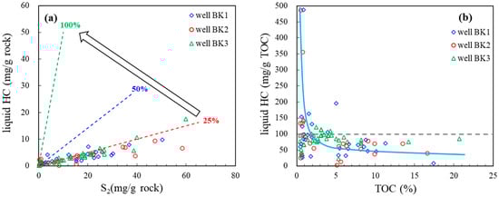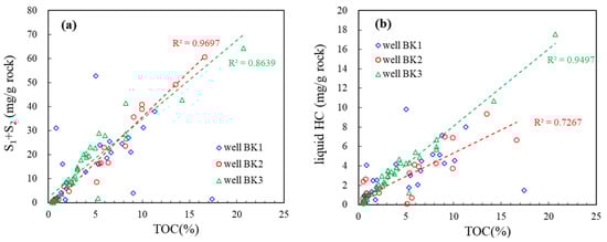 The most common parameters used to evaluate the hydrocarbon generation potential of source rocks are S1 and S2; S1 is associated with the soluble hydrocarbon content, and S2 represents hydrocarbons generated via pyrolysis [,]. The results of the pyrolysis analysis in this study showed that the S1 + S2 contents of Jurassic drill core samples from wells BK1, BK2, and BK3 ranged from 0.6 to 52.8, 0.3 to 49.2, and 0.2 to 64.4 mg/g of rock, respectively, with average values of 13.7, 15.9, and 15.3 mg/g of rock, respectively. This indicates that the hydrocarbon generation potential of Jurassic source rocks in this area is very high. As can be seen from Figure 11a, in well BK1, there was no apparent relationship between the TOC content and hydrocarbon generation potential (S1 + S2), while these parameters showed good linear relationships in wells BK2 and BK3. Generally, when organic matter is evenly distributed and no large-scale hydrocarbon migration occurs, S1 + S2 correlate well with the TOC content. If there is no significant correlation between these parameters in a well, this indicates that some differentiation of organic matter type or hydrocarbon migration has occurred (affecting the value of S1). There was no apparent correlation between the soluble hydrocarbon and TOC contents in well BK1, while good linear relationships occurred between these parameters in wells BK2 and BK3 (Figure 11b). As can be seen from Figure 6, the HI and H/C of well BK1 were lower than those of wells BK2 and BK3. One possible explanation for this is that the organic matter type within well BK1 is worse than that within wells BK2 and BK3. Alternatively, the maturity of well BK1 may be slightly higher than that of wells BK2 and BK3, reducing the hydrocarbon generation potential of the former. An increase in maturity leads to the light component of the product, which is more likely to result in hydrocarbon migration.